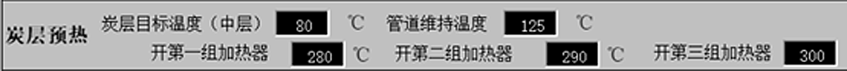 催化后溫度到達CO預熱設定的目標溫度后,進入炭層預熱階段,此階段脫附風機仍然保持運行,可以給風機設定一個固定頻率,打開管道閥1,打開管道閥2,打開炭箱的2個脫附閥,設定管道溫度(檢測溫度為混風箱后熱電偶溫度值),設定碳箱上層溫度(檢測溫度為碳箱上層熱電偶溫度值)。補冷閥根據管道溫度進行比例調節,補冷風機根據需要自動開啟(補風閥開度≥2%時),同時打開排放閥2。三組加熱器分別設定不同的溫度值,當催化后溫度低于設定值時,加熱器開啟。注:碳層預熱階段不可以打開排放閥1(排放閥1連接排放煙筒,有可能打開后造成濃度超標),如果碳箱或管道溫度高于設定溫度后這時需要從排放閥2排出。此階段需要設置的參數如圖4所示。